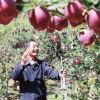 礼县农民张加成正在田间直播销售苹果。李旭春　摄<br />