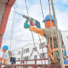 图为施工人员为政和街区老旧楼房加固外层保温板。&nbsp;融媒体中心记者&nbsp;李巍&nbsp;摄<br />
