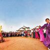 大家围着篝火跳锅庄舞。<br />