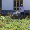 红旗村村民余瑞山为农家乐菜园浇水。<br />