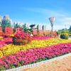 市民在雄关广场欢度国庆主题花坛前拍照留念<br />