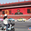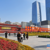 市民在兰州东方红广场驻足观看中国共产党第二十次全国代表大会开幕会。<br />