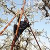 果农踩着云梯为梨花人工授粉<br />