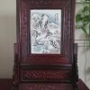 据悉，该瓷板插屏通体采用大红酸枝老料制作，屏心一面采用&ldquo;瑞雪初霁&rdquo;雪景瓷版镶嵌。另一面手工雕刻童趣喜庆图，正反二面均可按喜好随意摆放。插屏底座采用回纹及西番莲卷草花浅雕、镂空雕技艺相结合，设计巧妙自然，增添插屏的画面情趣。<br />