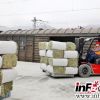 工人利用叉车把一捆捆优质牧草整齐安稳地放进车厢<br />