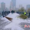 在酒泉路上记者看到，保洁员们小心翼翼地拾级而上，将过街天桥上的积雪扫成小堆，然后再集中收集清理。在人行道和公交站台前，几名环卫工人挥动扫帚清扫积雪，漫天雪花中，一个个荧光绿清洁了城市，给市民带来了安全。<br />